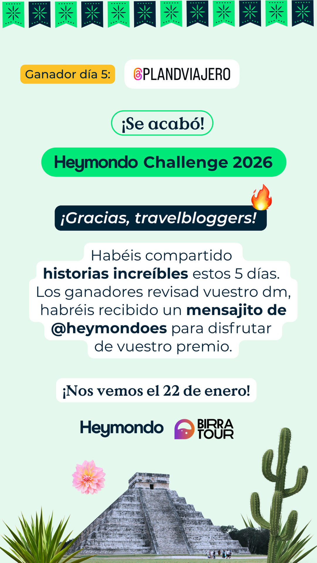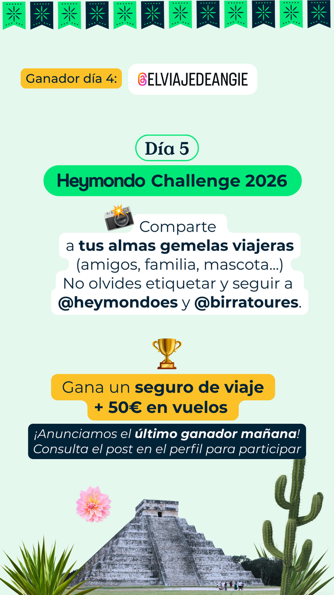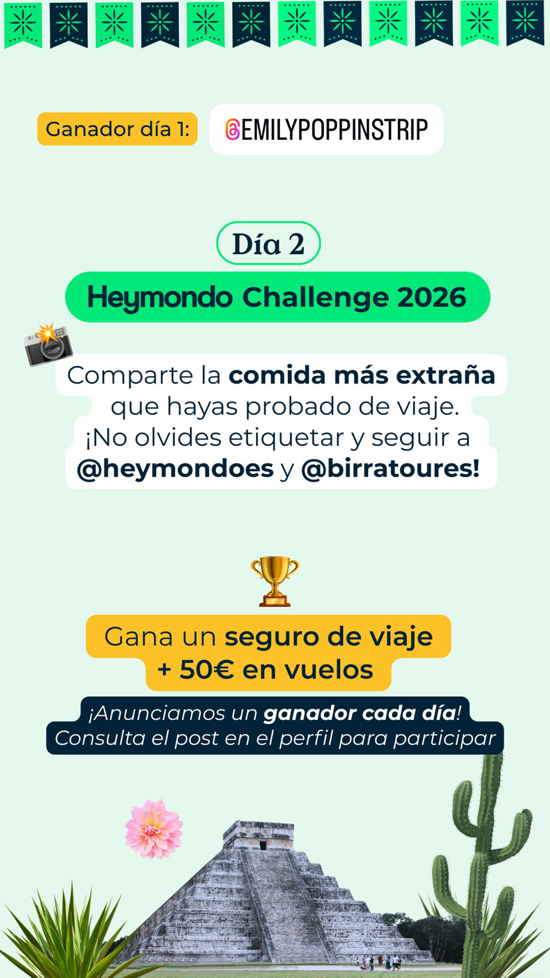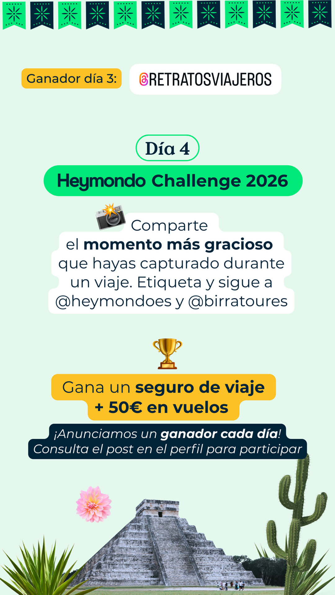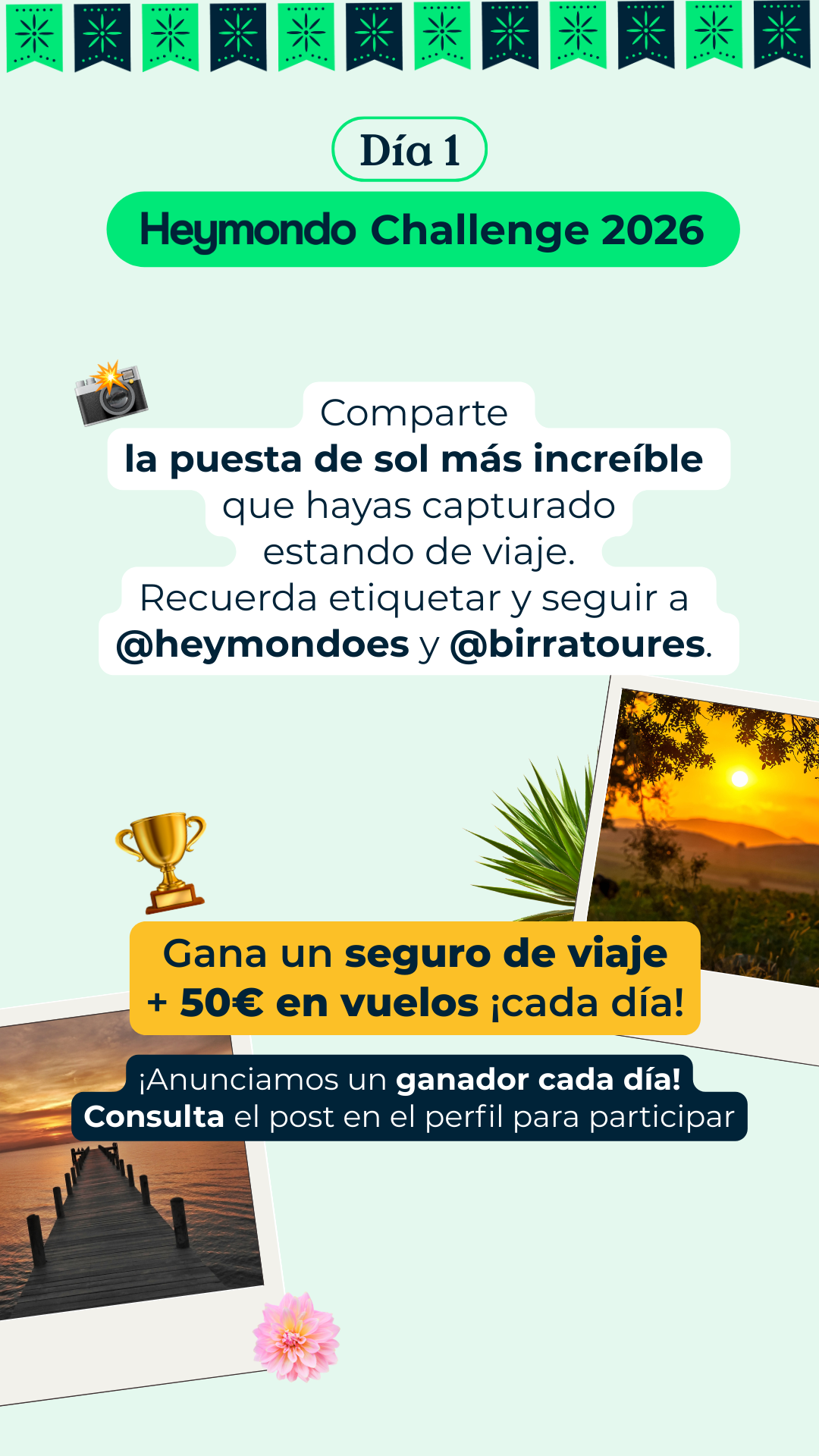 En Birratour nos gustan los retos, y si hay una marca que sabe jugar, innovar y estar cuando hace falta, esa es Heymondo. Por eso, un año más, vuelve a formar parte de nuestra aventura para ponernos a prueba y recordarnos que viajar mola más cuando sabes que alguien te cubre las espaldas. Pero antes de contarte todo lo que está por venir (spoiler: retos, premios y sorpresas), déjanos contarte por qué Heymondo es uno de los mejores compañeros de viaje que podemos tener. Heymondo lleva más de 8 años cuidando a viajeros de todo el mundo (desde febrero de 2017, que no es poco) y hoy en día asegura a más de 1 millón de personas al año. Son líderes en el sur de Europa y están presentes en España, Francia, Portugal, Italia, Estados Unidos y Rumanía. Viajar con Heymondo es sinónimo de tranquilidad. Todos sus seguros incluyen asistencia 24/7 los 365 días del año, reembolso de la reserva incluso si finalmente no viajas y chat y videoconsulta médica siempre disponibles. Todo lo puedes gestionar de forma rápida y sencilla desde la App de Heymondo, pionera en el mercado español en asistencia en viaje. ¿Necesitas algún motivo más para irte de viaje con ellos? Si es así, aquí lo tienes: su seguro de viaje Premium con gastos médicos ilimitados para viajes fuera de Europa y de países ribereños. Porque si tus ganas de descubrir el mundo no tienen límites, tus gastos médicos tampoco deberían tenerlos. Viaja con el respaldo de un equipo médico disponible 24/7 y siempre con la asistencia a golpe de click desde la app. Sin líos, sin sustos y sin facturas que quitan el sueño. Y como los imprevistos también forman parte del viaje, Heymondo ha incorporado un servicio que es puro mimo viajero: la cobertura paramétrica de Salas VIP en aeropuertos. Si tu vuelo se retrasa más de 2 horas y media, se activa automáticamente y puedes elegir entre acceso a una sala VIP o una compensación directa de 50 €. Porque ya que toca esperar, mejor hacerlo con café y en un sillón cómodo, ¿no crees? Por cierto, si eres creador de contenido, esto te interesa (y mucho). Cada vez más creadores se suman al programa de afiliados de Heymondo, y no es casualidad. Ofrecen uno de los mejores productos del mercado, un panel de control muy completo, formaciones y una gran comunidad de afiliados fieles, construida desde un enfoque cercano y humano. Un programa pensado para crecer juntos… y viajar mejor. Para ir abriendo boca antes de Birratour, Heymondo lanza su ya conocido #HeymondoChallenge, un reto online pensado para fomentar la creatividad y espíritu viajero en Instagram. 📅 Duración: del 11 al 15 de enero ¿Cómo participar? ⏰ El reto de cada día se cierra a las 23:59h (hora peninsular). 📣 El ganador o ganadora se anunciará al día siguiente en los stories de @birratoures, junto con el nuevo reto diario, excepto el día 16 de enero, que solo se anunciará el ganador del reto del día 15 de enero. Puedes consultar las bases legales en el este enlace. Si pensabas que las sorpresas de Heymondo se quedaban en el reto online, sentimos decirte que solo estamos calentando motores. Para el día del evento, Heymondo tiene preparada una sorpresa muy top, relacionada, cómo no, con viajes. De momento no podemos contar mucho más… pero si algo tenemos claro es que merecerá la pena la espera.Heymondo: tranquilidad para viajar… y para crear contenido