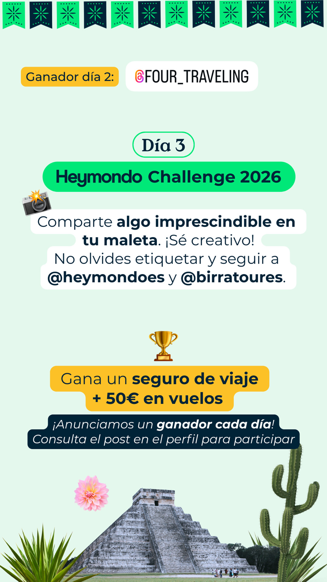 En Birratour nos gustan los retos, y si hay una marca que sabe jugar, innovar y estar cuando hace falta, esa es Heymondo. Por eso, un año más, vuelve a formar parte de nuestra aventura para ponernos a prueba y recordarnos que viajar mola más cuando sabes que alguien te cubre las espaldas. Pero antes de contarte todo lo que está por venir (spoiler: retos, premios y sorpresas), déjanos contarte por qué Heymondo es uno de los mejores compañeros de viaje que podemos tener. Heymondo lleva más de 8 años cuidando a viajeros de todo el mundo (desde febrero de 2017, que no es poco) y hoy en día asegura a más de 1 millón de personas al año. Son líderes en el sur de Europa y están presentes en España, Francia, Portugal, Italia, Estados Unidos y Rumanía. Viajar con Heymondo es sinónimo de tranquilidad. Todos sus seguros incluyen asistencia 24/7 los 365 días del año, reembolso de la reserva incluso si finalmente no viajas y chat y videoconsulta médica siempre disponibles. Todo lo puedes gestionar de forma rápida y sencilla desde la App de Heymondo, pionera en el mercado español en asistencia en viaje. ¿Necesitas algún motivo más para irte de viaje con ellos? Si es así, aquí lo tienes: su seguro de viaje Premium con gastos médicos ilimitados para viajes fuera de Europa y de países ribereños. Porque si tus ganas de descubrir el mundo no tienen límites, tus gastos médicos tampoco deberían tenerlos. Viaja con el respaldo de un equipo médico disponible 24/7 y siempre con la asistencia a golpe de click desde la app. Sin líos, sin sustos y sin facturas que quitan el sueño. Y como los imprevistos también forman parte del viaje, Heymondo ha incorporado un servicio que es puro mimo viajero: la cobertura paramétrica de Salas VIP en aeropuertos. Si tu vuelo se retrasa más de 2 horas y media, se activa automáticamente y puedes elegir entre acceso a una sala VIP o una compensación directa de 50 €. Porque ya que toca esperar, mejor hacerlo con café y en un sillón cómodo, ¿no crees? Por cierto, si eres creador de contenido, esto te interesa (y mucho). Cada vez más creadores se suman al programa de afiliados de Heymondo, y no es casualidad. Ofrecen uno de los mejores productos del mercado, un panel de control muy completo, formaciones y una gran comunidad de afiliados fieles, construida desde un enfoque cercano y humano. Un programa pensado para crecer juntos… y viajar mejor. Para ir abriendo boca antes de Birratour, Heymondo lanza su ya conocido #HeymondoChallenge, un reto online pensado para fomentar la creatividad y espíritu viajero en Instagram. 📅 Duración: del 11 al 15 de enero ¿Cómo participar? ⏰ El reto de cada día se cierra a las 23:59h (hora peninsular). 📣 El ganador o ganadora se anunciará al día siguiente en los stories de @birratoures, junto con el nuevo reto diario, excepto el día 16 de enero, que solo se anunciará el ganador del reto del día 15 de enero. Puedes consultar las bases legales en el este enlace. Si pensabas que las sorpresas de Heymondo se quedaban en el reto online, sentimos decirte que solo estamos calentando motores. Para el día del evento, Heymondo tiene preparada una sorpresa muy top, relacionada, cómo no, con viajes. De momento no podemos contar mucho más… pero si algo tenemos claro es que merecerá la pena la espera.Heymondo: tranquilidad para viajar… y para crear contenido